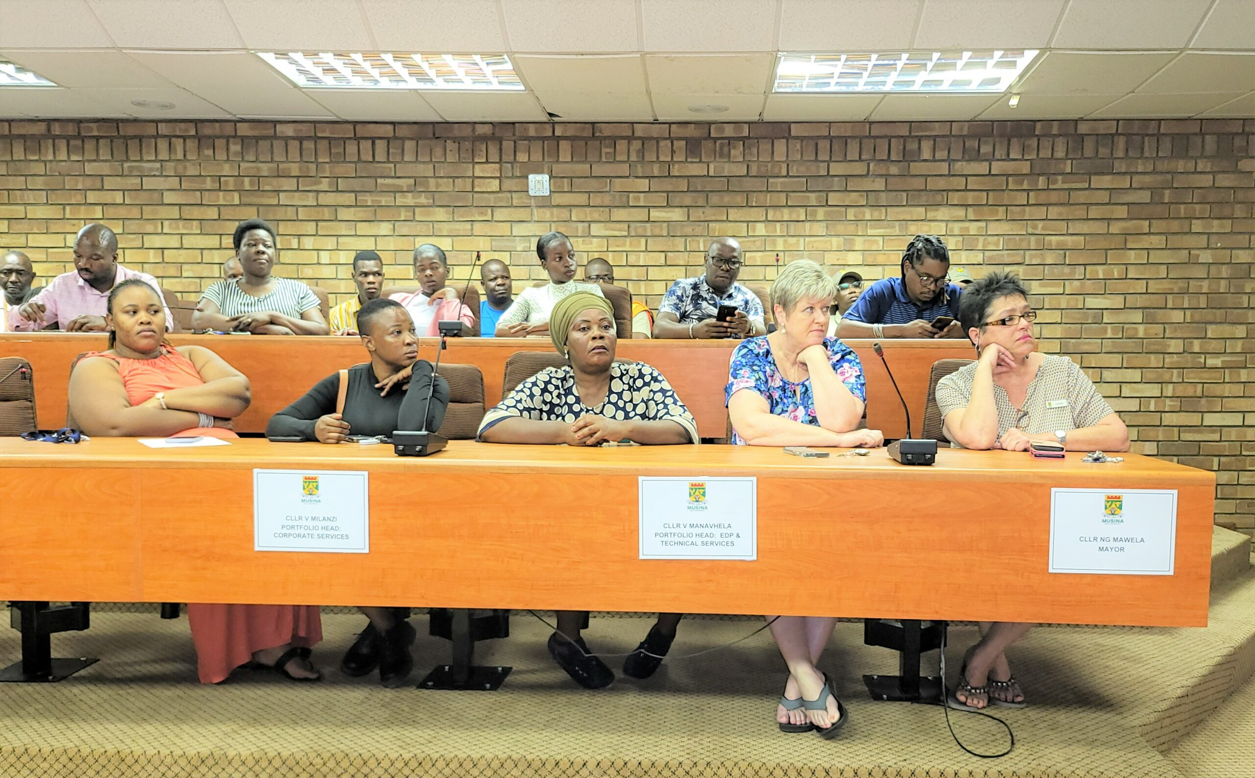 Shortly after his appointment, Municipal Manager, Nathi Tshiwanammbi had a meeting with staff members to outline his plans for the next five years. In the photo, staff members listen attentively as Tshiwanammbi addresses them.