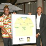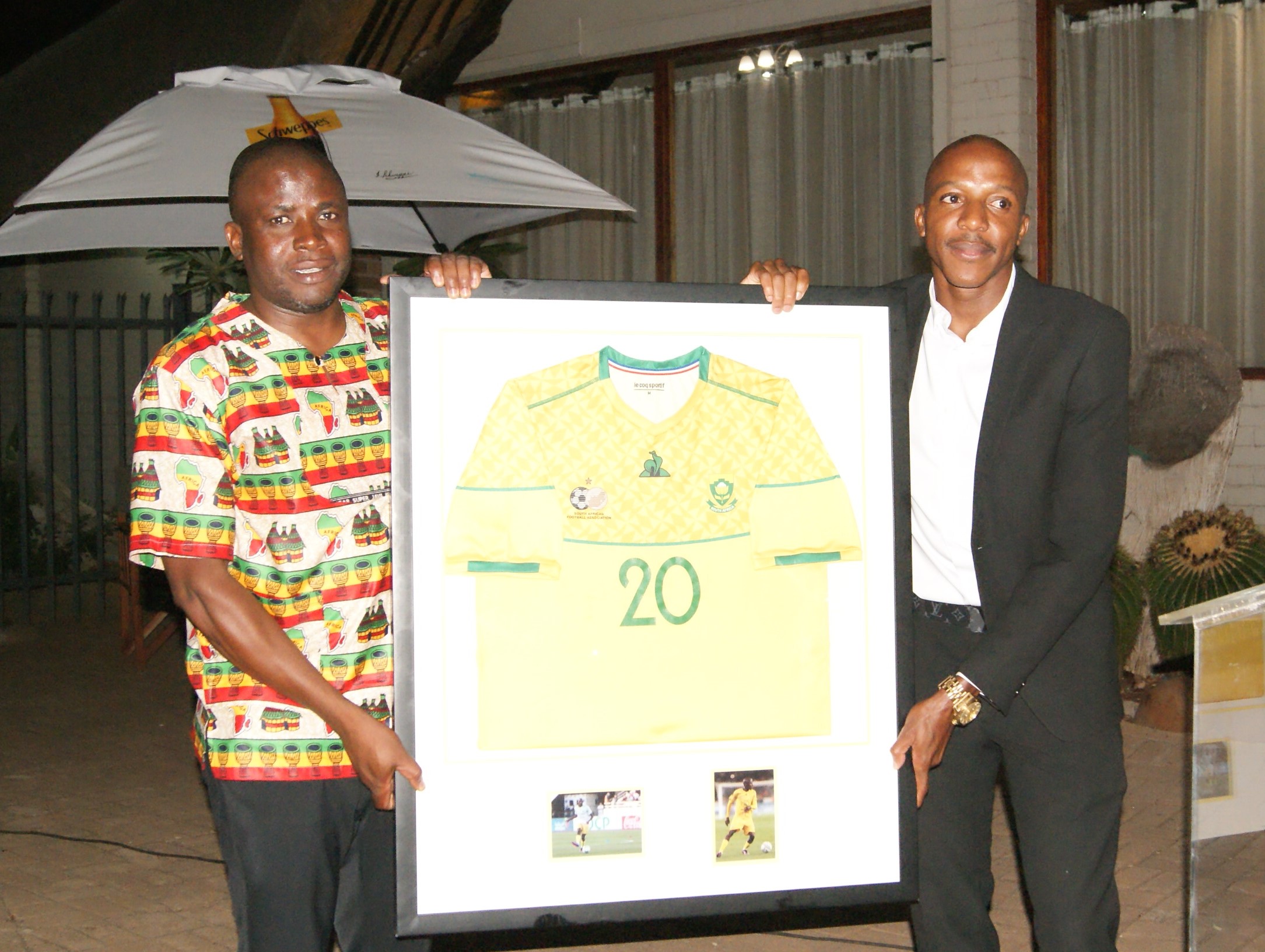 Top South African professional soccer player, Khuliso “Sailor” Mudau was appreciated during a glittering gala dinner in his honour. Born and bred in Musina 28 years ago, Mudau rose from humble beginnings after playing soccer in the streets on Musina and joined JDR Stars. From JDR Stars, he joined Magezi FC and proceeded to Black Leopards until his talent lands him to his current club, Mamelodi Sundowns. Besides playing for Mamelodi Soundowns, Mudau has also represented South Africa by playing for the national soccer team, Bafana Bafana on several occasions. In the photo, Mudau is captured with Musina Mayor, Cllr Nkhanedzeni Godfrey Mawela during the event.