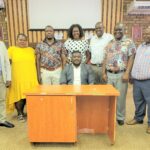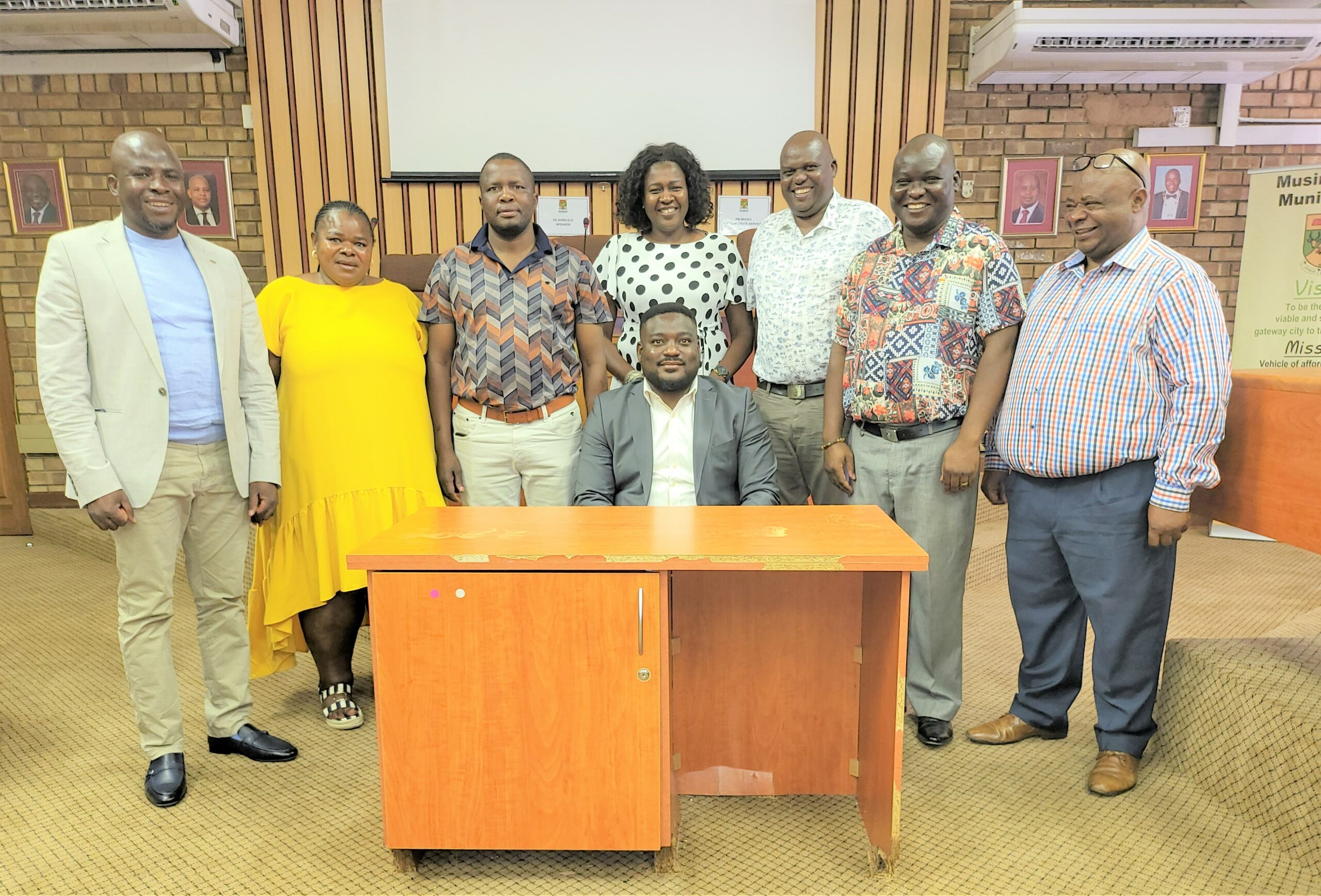 Mr Nathi Tshiwanammbi (seated) was retained as Municipal Manger for another five-year term. Welcoming him are from left to right: Cllr Godfrey Mawela (Mayor), Cllr Viviene Milanzi (EXCO), Cllr Fistos Mafela (Chief Whip), Cllr Siyaphi Shirilele (Speaker), Cllr Victor Manavhela (EXCO), Thomas Nephawe (CFO) and Midas Mudau (GM Corporate Services).
